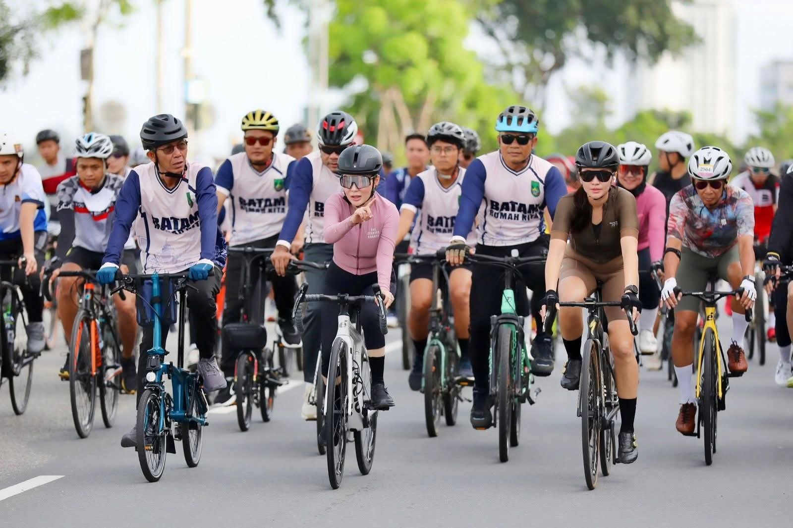 Wali Kota Batam H Amsakar Achmad, bersama Wakil Wali Kota Batam Li Claudia Chandra, ikut gowes usai melepas peserta.