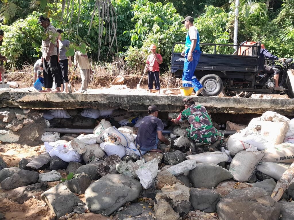 “Tadi malam kami rapat dan pagi hari ini kami gotong royong bersama pak Tentara dan unsur lainnya. Kami berupaya menutup kikisan air yang berada dibawah jalan itu, membersihkan sampah-sampah laut dan kegiatan perbaikan lainnya. Dan ini setiap tahun kami lakukan,” tutur Muslini.