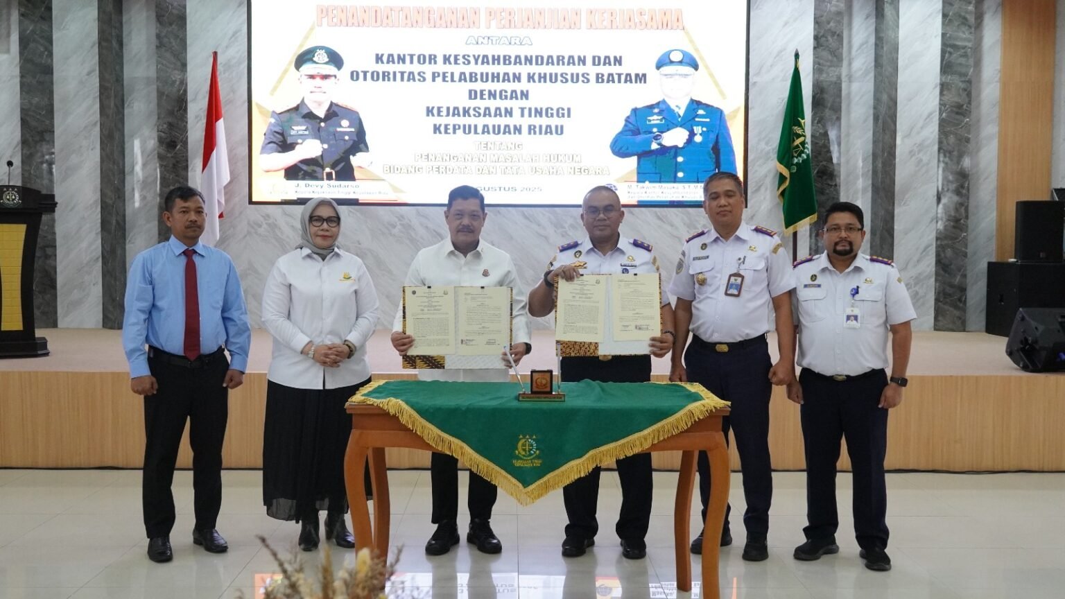 TANJUNGPINANG (HK) – Kejaksaan Tinggi Kepulauan Riau (Kejati Kepri) dan Kantor Kesyahbandaran dan Otoritas Pelabuhan (KSOP) Khusus Batam resmi menandatangani Perjanjian Kerja Sama tentang Penanganan Masalah Hukum di Bidang Perdata dan Tata Usaha Negara. Acara berlangsung di Aula Sasana Baharuddin Lopa Kejati Kepri, dihadiri jajaran pejabat kedua instansi serta perwakilan Unit Pelaksana Teknis (UPT) Kementerian Perhubungan se-Kepulauan Riau, Rabu (13/08/2025).