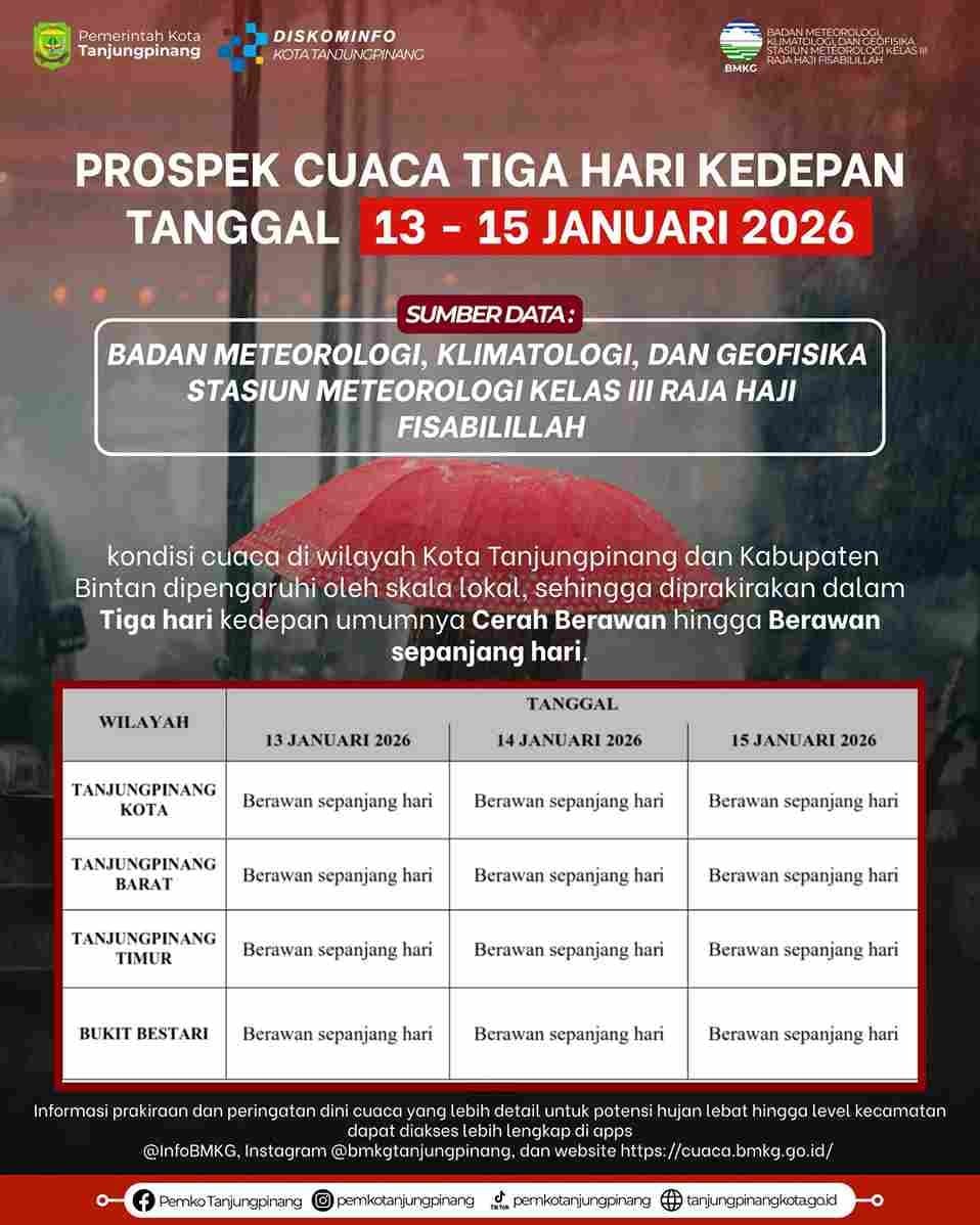 TANJUNGPINANG (HK) – Badan Meteorologi, Klimatologi, dan Geofisika (BMKG) melalui Stasiun Meteorologi Kelas III Raja Haji Fisabilillah Tanjungpinang merilis prospek cuaca tiga hari ke depan untuk wilayah Kota Tanjungpinang dan Kabupaten Bintan, terhitung tanggal 13 hingga 15 Januari 2026. Berdasarkan hasil analisis, kondisi cuaca pada periode tersebut diprakirakan cerah berawan hingga berawan sepanjang hari.