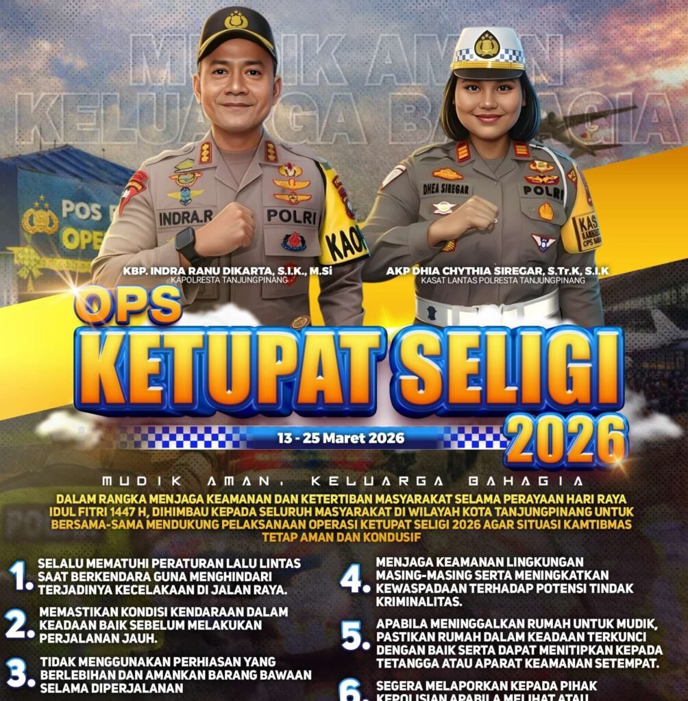 “Dalam rangka menjaga keamanan dan ketertiban masyarakat selama perayaan hari raya Idul Fitri 1447 H, kami juga menghimbau kepada seluruh masyarakat kota Tanjungpinang untuk bersama-sama mendukung pelaksanaan operasi Ketupat Seligi 2026 agar situasi tetap aman dan kondusif”, terang Kapolresta Tanjungpinang Kombes Pol. Indra Ranu Dikarta, S.I.K., M.Si.